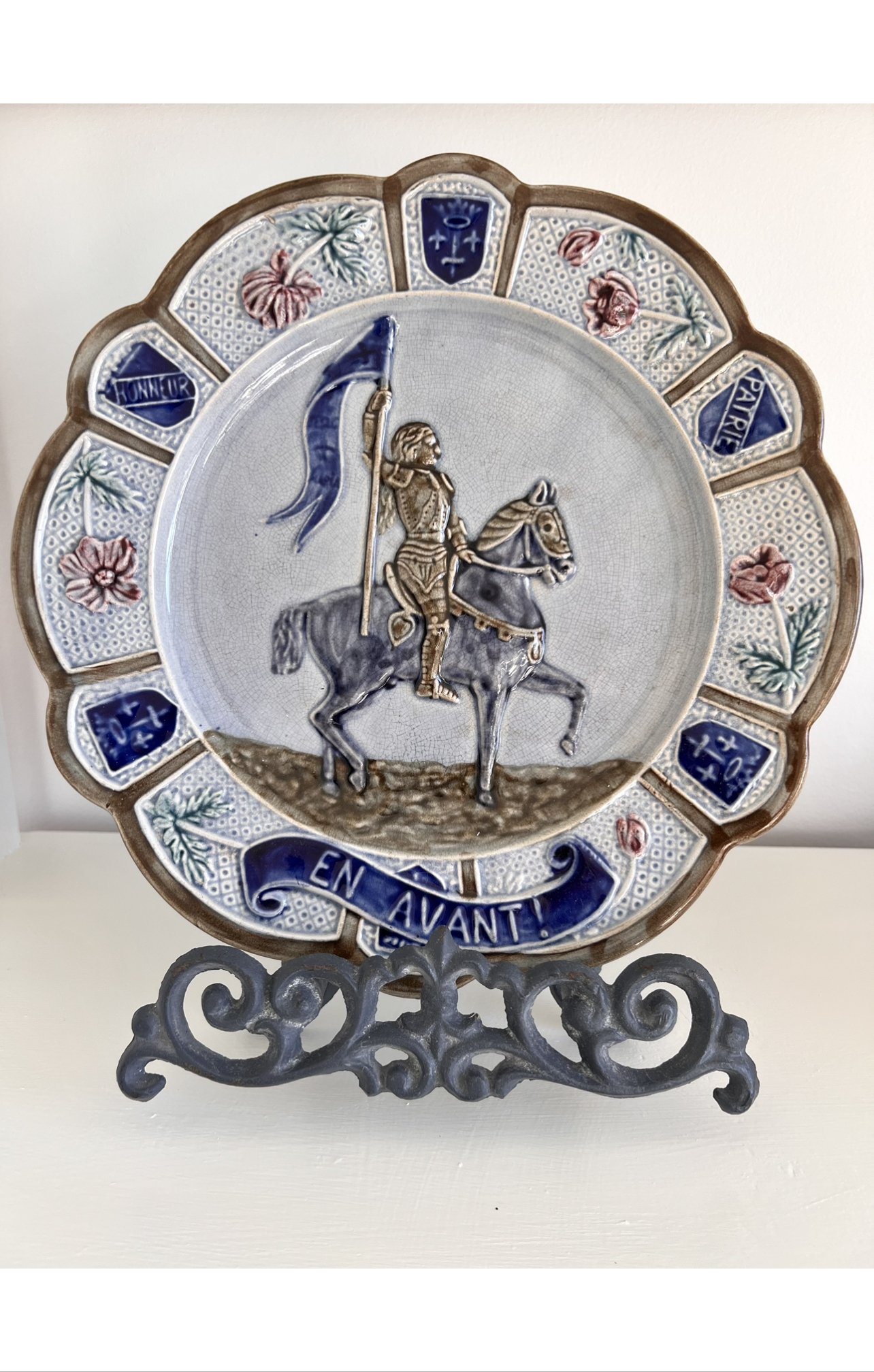 Beautiful and hard to find, this rare large barbotine plate has voyaged from France to join your home as a symbol of courage and a timeless reminder to keep going. Jeanne d’Arc is featured on this plate with the French inscription “En Avant” or “Onward”. It has long been a favorite French phrase of mine and this lovely treasure is a perfect way to display it. A perfect accompaniment to Mark Twain’s Personal Recollections of Joan of Arc available here. Price includes this perfectly ornate matching plate stand.